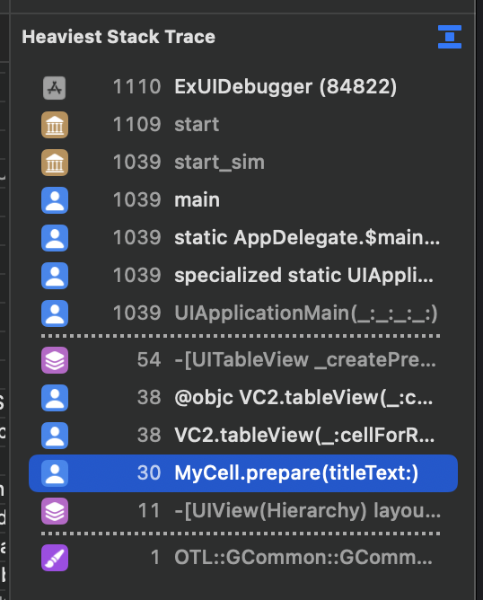 - MyCell코드를 보니 prepare에서 계속 titleLabel 인스턴스를 지우고 생성하므로 재사용성에 안좋은 코드이며, layoutIfneeded()를 매번 호출하므로 UI성능에 안좋은 효과