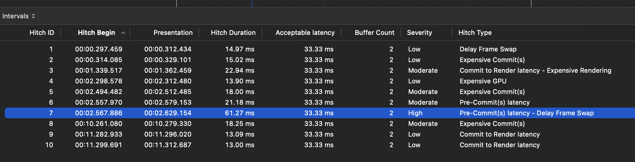 (Severity high인 것들을 대략적으로 확인하고 Hitch Duration이 큰 값을 확인 - 7번 Hitch ID가 duration이 33.33ms보다 높으므로 frame이 지연되어 버벅거리게 되는 버그 발생)