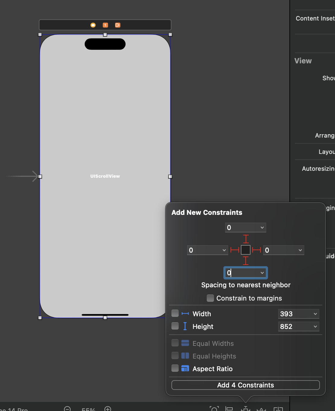 - content layout guide는 스크롤 뷰 안에 새로운 뷰를 추가하여 그 뷰를 constraint할 때 사용