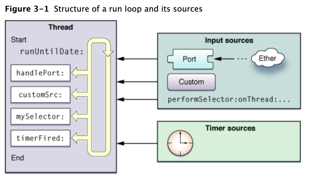 - 입력 소스(터치, 등)와 타이머 소스에 관한 이벤트 처리를 할 때 하나의 loop를 두고 그 loop안에서 이벤트를 받고 처리하는 부분을 나누는데 이때의 loop를 runloop라고 명칭 (아래 그림에서 노란색 부분)