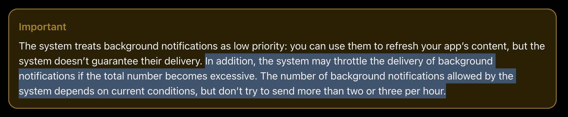 - 이 푸시는 우선순위가 낮으므로 짧은 시간에 push notification 수가 많아지면 전달되지 않을 수 있으므로 시간당 2~3개 이상은 보내지 말 것
