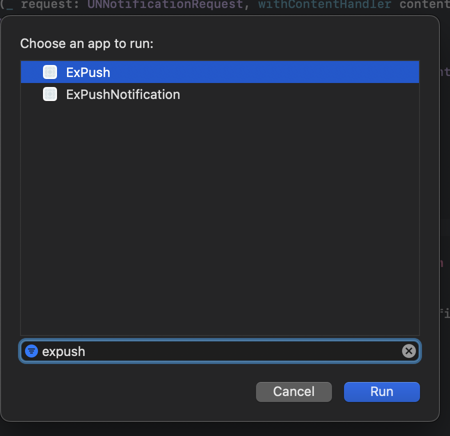 - cmd + R하면 run할 앱을 선택하라고 하는데, 이때 본 앱 'ExPush' 선택