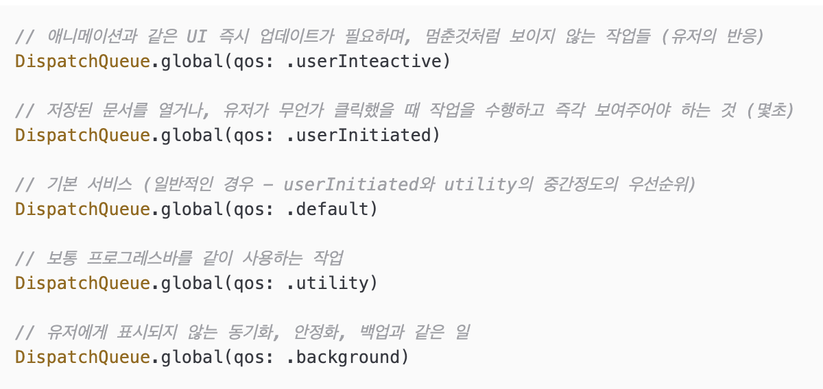 - 시스템에 스레드 제어권을 넘기기 때문에 개발자는 따로 우선순위를 정하여 작업을 요청하는 global queue에서의 qos도 있는것