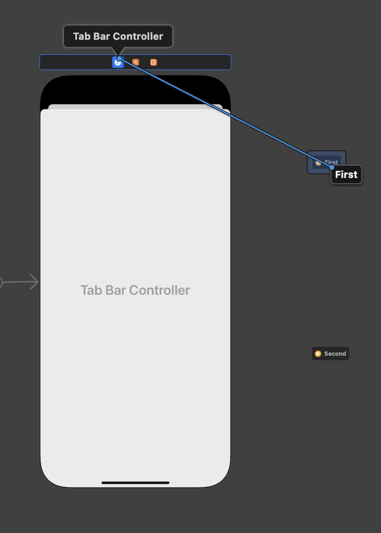 - Tab Bar Controller의 첫 번째 아이콘을 클릭한 후, Ctrl + 드래그를 하여 Storyboard Reference 와 연결