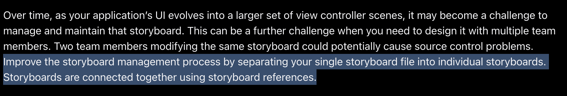 - Storyboard Reference를 사용하여 UI를 구현할 때, 하나의 UIViewController 당 하나의 Storyboard를 갖게끔하도록 ViewController를 분리할 것