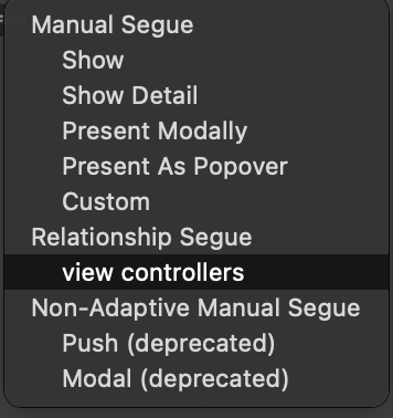 - segue 타입은 view controllers 선택