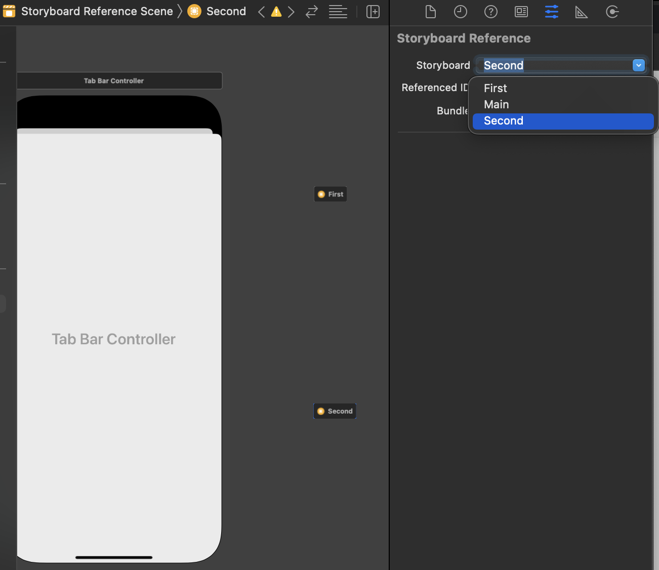 - Storyboard Reference를 선태갛고 Storyboard 항목에서 위에서 만든 First, Second 선택