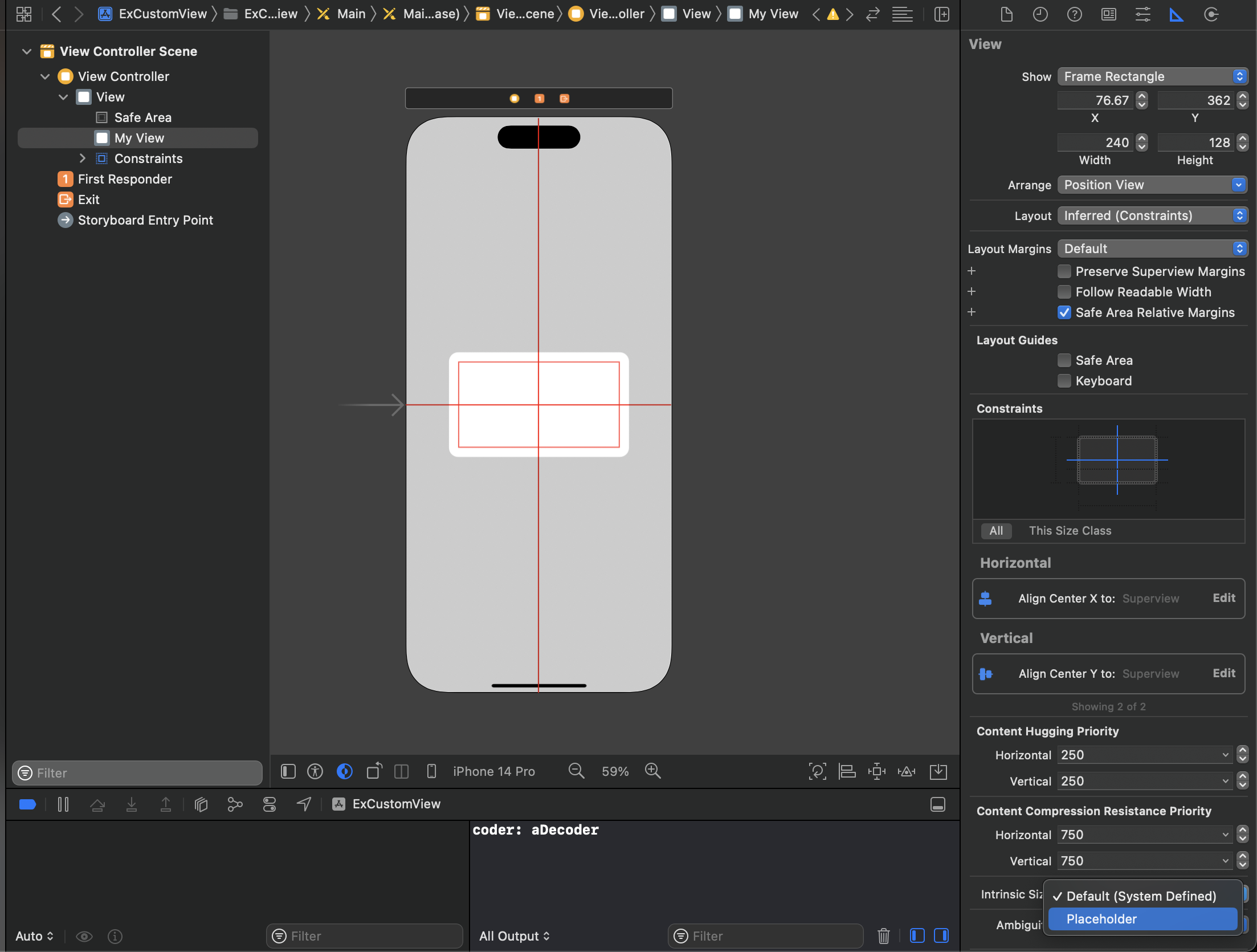 - 우측 하단의 intrinsic content size > placeholder로 변경하여 커스텀뷰의 사이즈만큼 사이즈가 결정되도록 설정