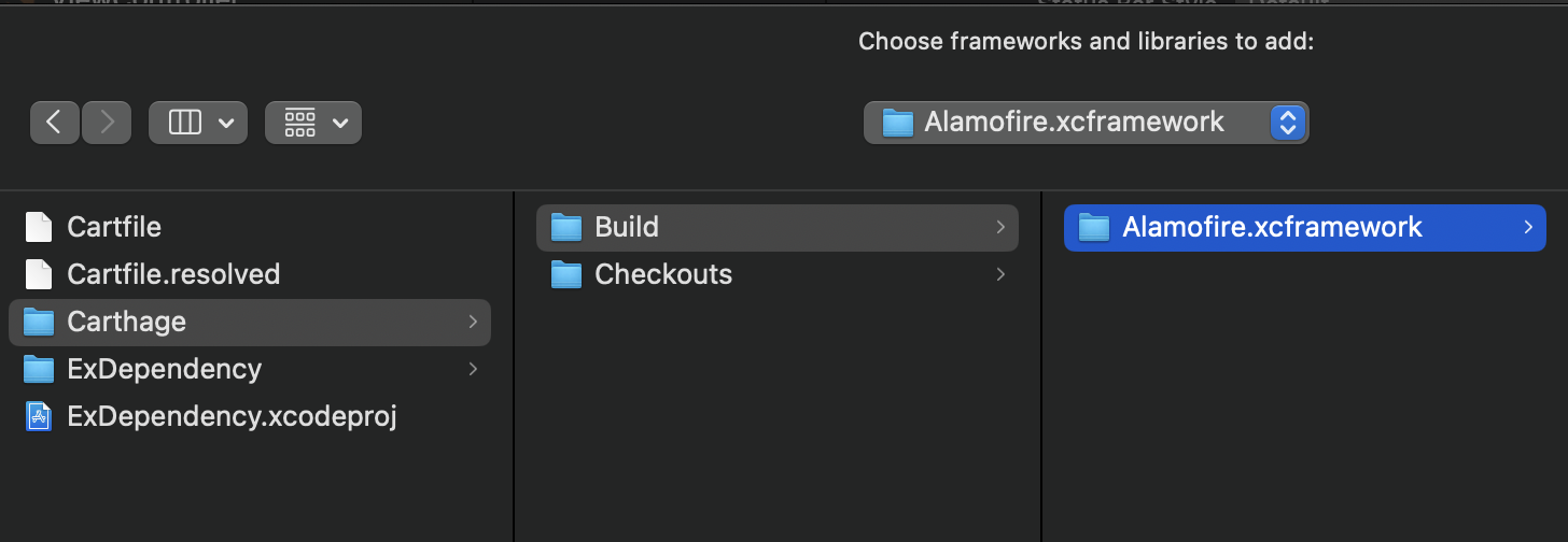 - Carthage 폴더에는 빌드된 프레임워크의 내용이 존재 (info.plist, ios-arm64 전용, x86 전용 Alamofire의 내용이 존재)