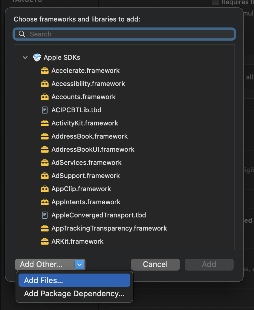 - Target > General > Frameworks, Libraries, and Embedded Content > + 버튼 클릭