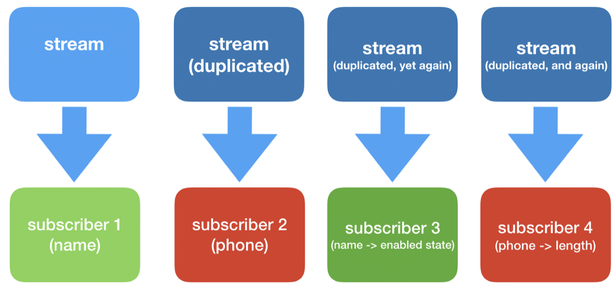 subscriber1(name), subscriber2(phone)는 각각 각자의 stream을 사용하는 것