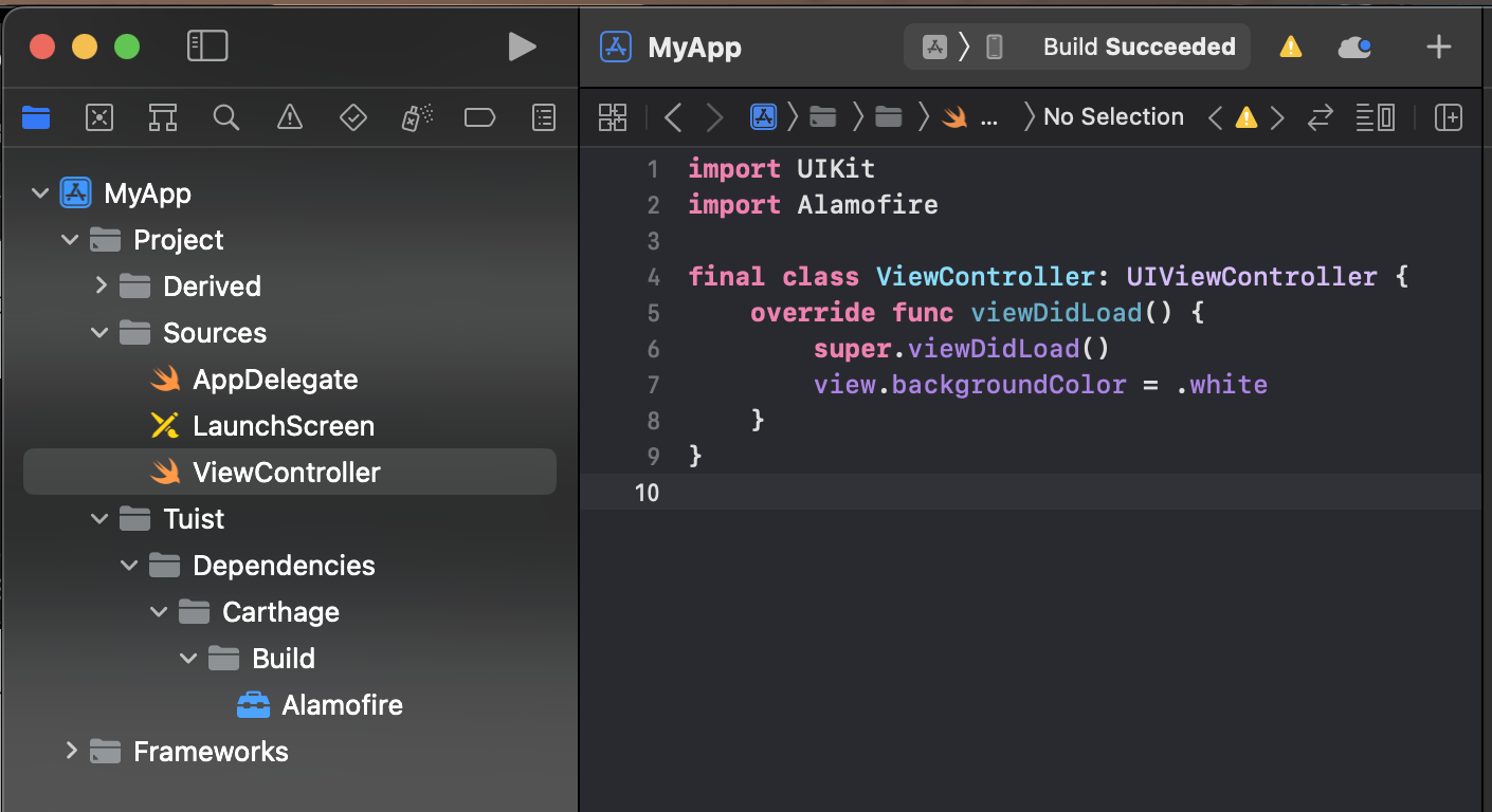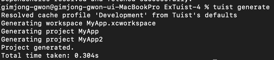 (위에서 의존성 설정한 Alamofire를 얻어오기위해 tuist fetch 먼저 수행)