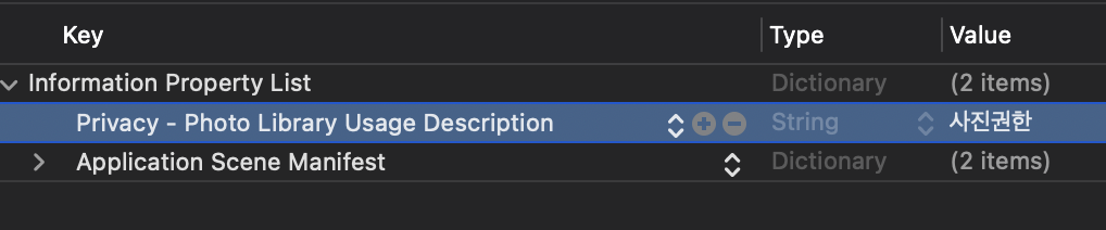 - 사진 권한 message 문구를 위해 info.plist에 아래 내용 추가