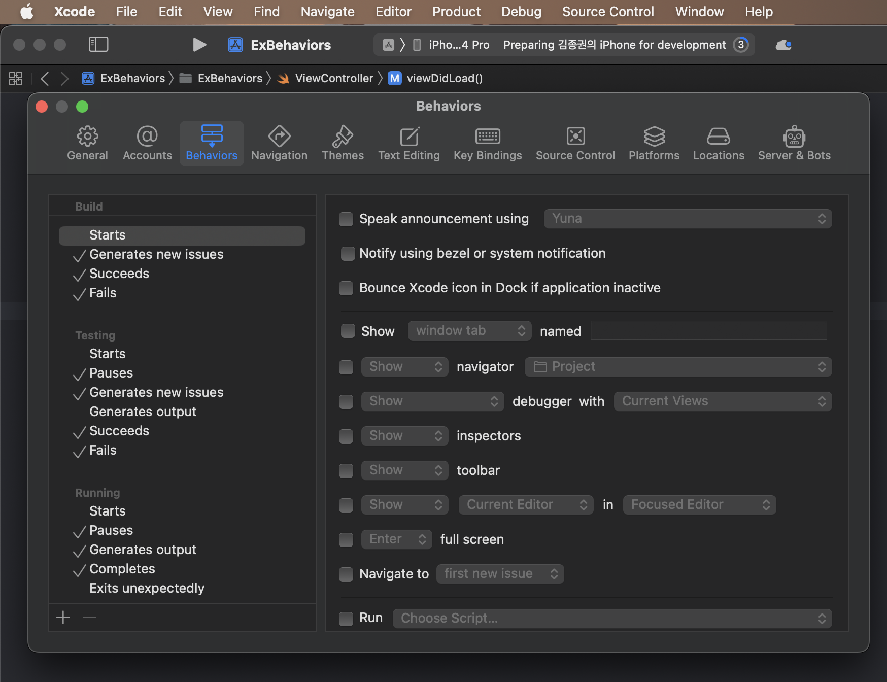 - Xcode > Behaviors > 아까 만들었던 커스텀 behavior를 선택한 후, 쉘스크립트를 선택