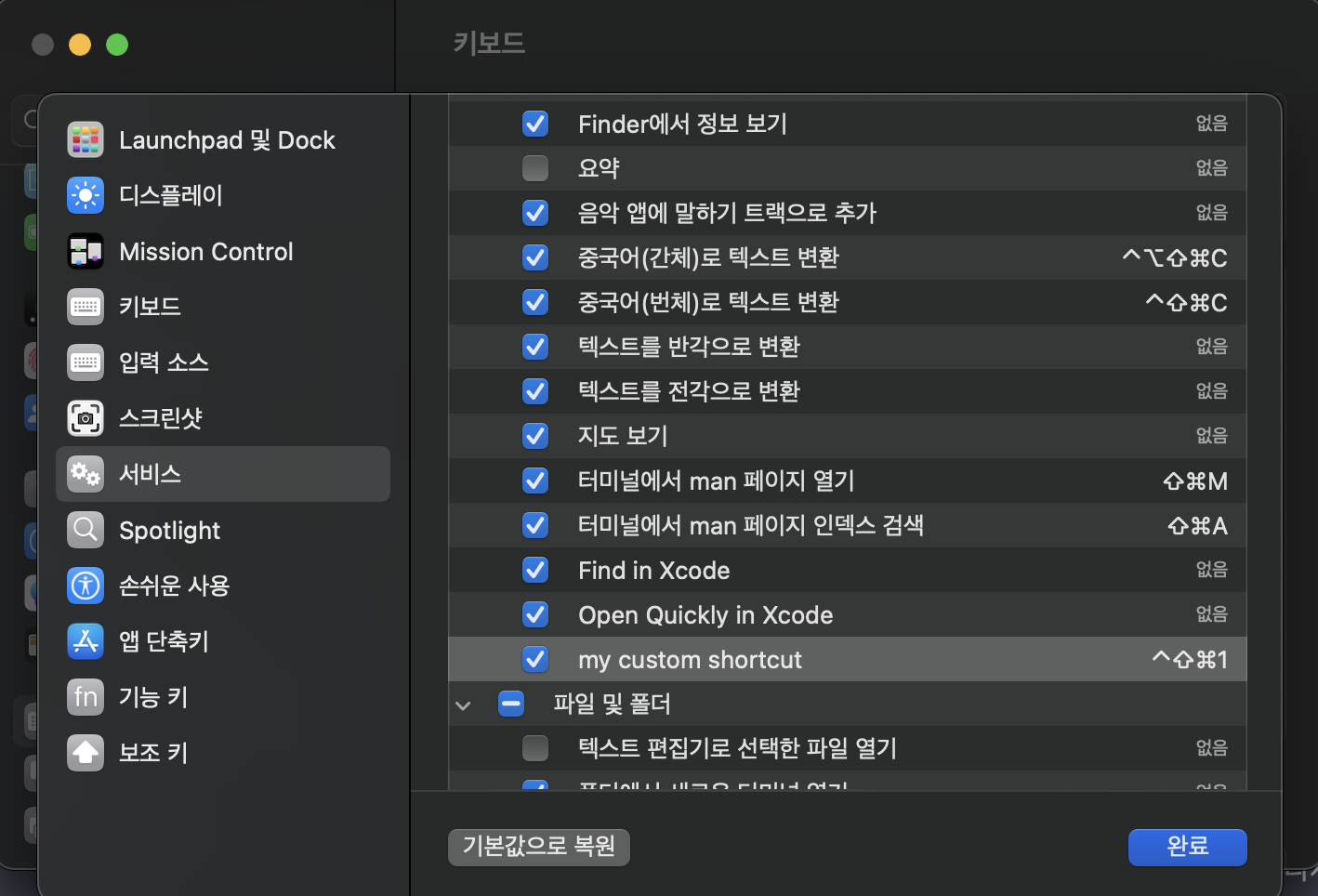 - 시스템 환경설정의 키보드 -> 키보드 단축키 -> 서비스 탭 -> 오른쪽 목록 텍스트 하위에서 키보드 단축키 등록