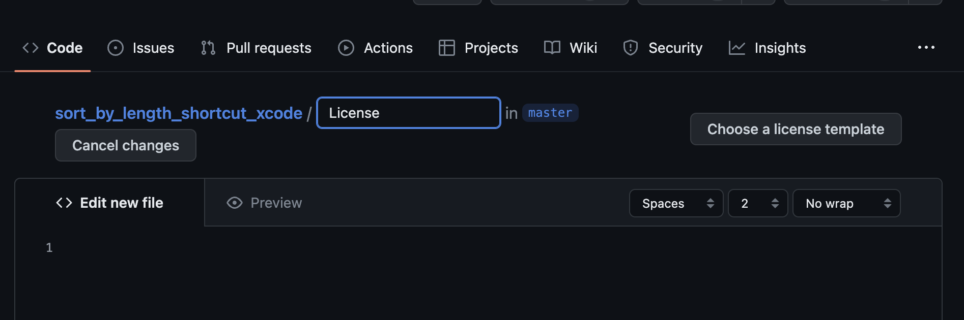 - License라고 타이핑 > 오른쪽에 Choose a license template 버튼 탭