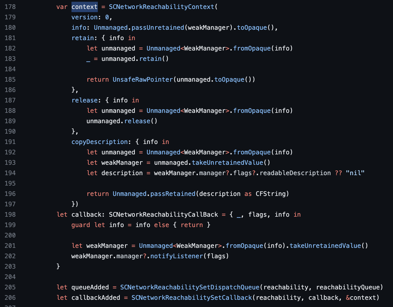 https://developer.apple.com/documentation/systemconfiguration/scnetworkreachabilitycontext