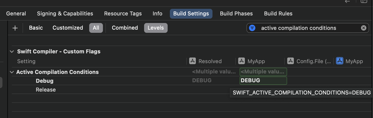 - Xcode > Build Settings > Active Comiplation Conditions에서 설정