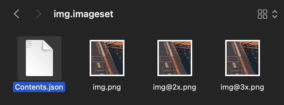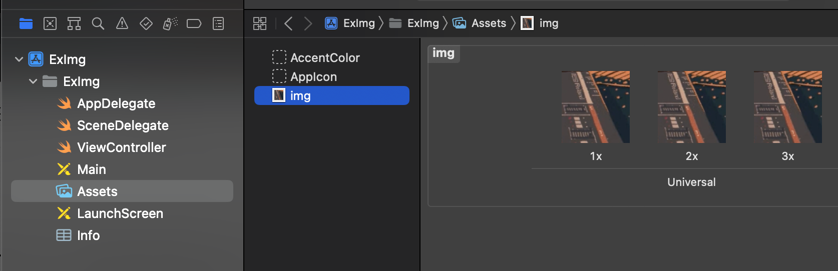- Xcode에서 이미지 관리 파일 img.png, img@2x.png, img@3x.png 추가하면 아래처럼 생성