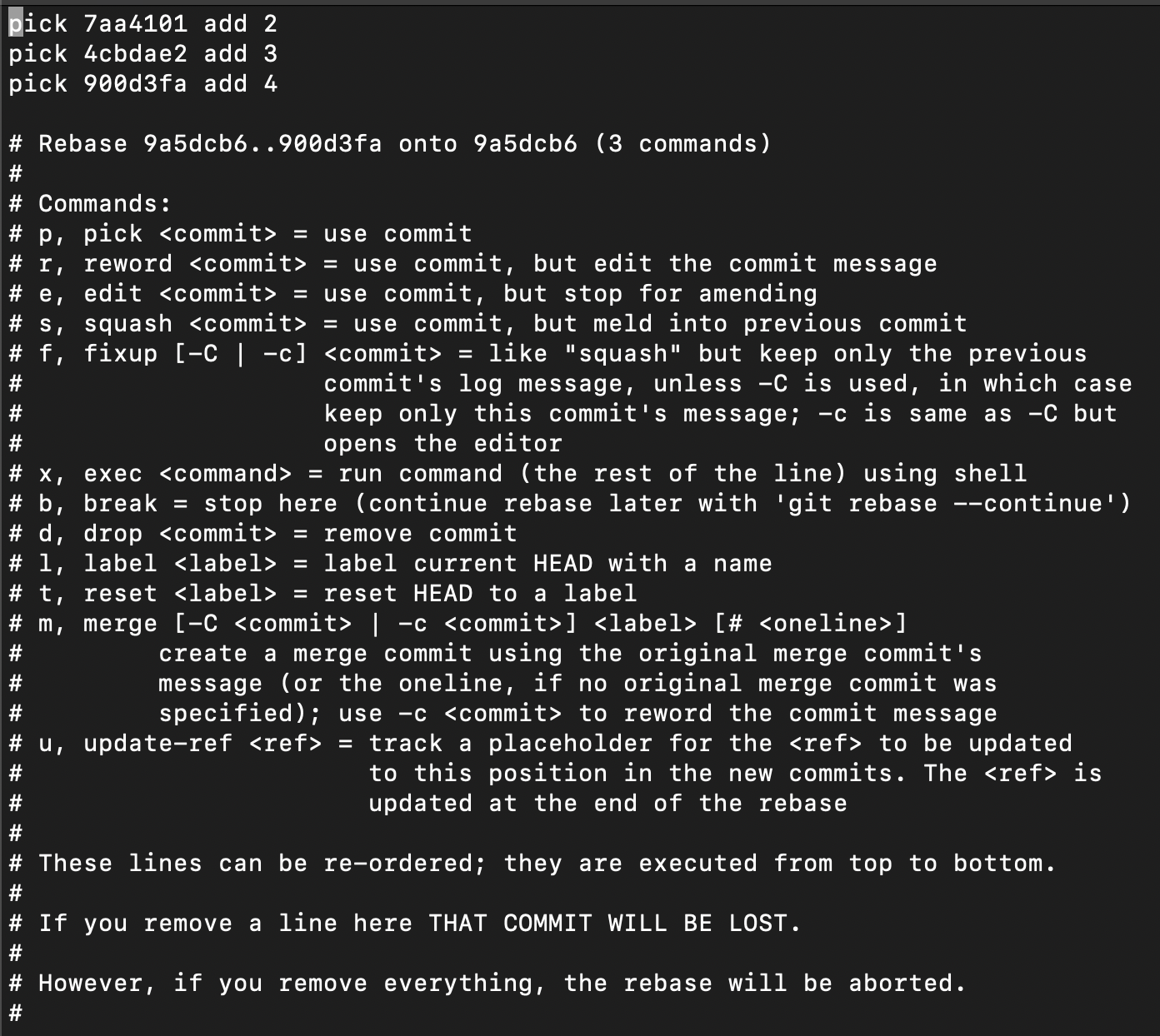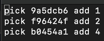 - 2와 3을 합쳐야하므로 add 3 커밋을 squash하면 이전 커밋인 add 2와 합쳐지게 됨