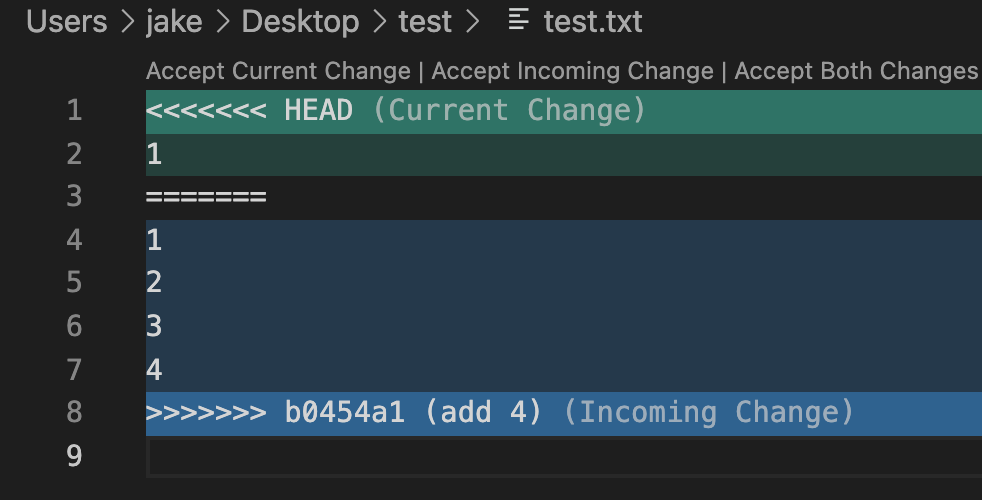 - vscode로 test.txt 열면 컨플릭 쉽게 확인이 가능