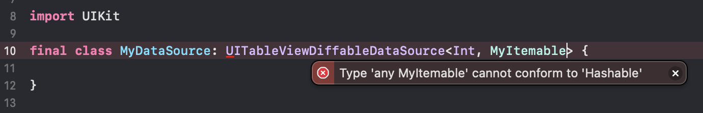 final class MyDataSource: UITableViewDiffableDataSource<Int, MyItemable> { // Error!