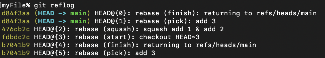 - 로그중 HEAD@{3}부분을 보면 git rebase -i를 시도하여 checkout된것을 확인 가능