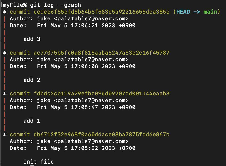 ex) 현재 아래(위가 최신)처럼 init file, add 1, add 2, add 3이 있을 때 add 3 커밋 날리기