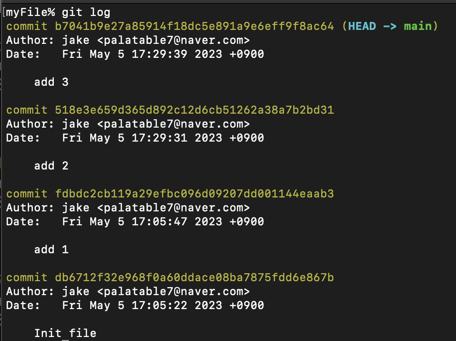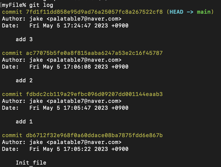 ex) 현재 아래(위가 최신)처럼 init file, add 1, add 2, add 3이 있을 때 add 3 커밋 날리기