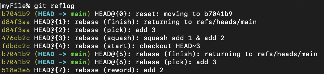 - 로그중 HEAD@{3}부분을 보면 git rebase -i를 시도하여 checkout된것을 확인 가능