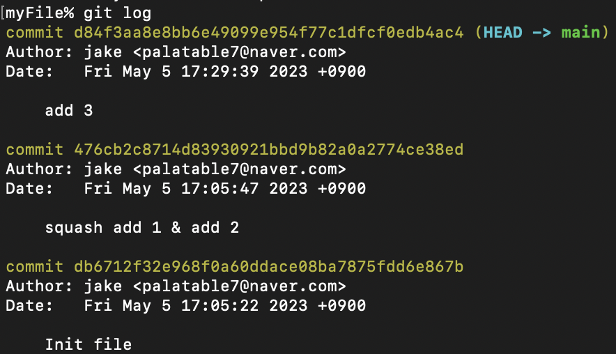 - git rebase -i HEAD~3를 통해 HEAD를 "init file" 커밋으로 이동하고 rebase interactive 시작