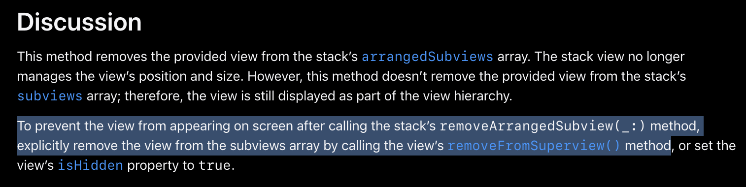 - 공식 문서에서도 removeArrangedSubview()만 사용하면 뷰가 보일 수 있으니, 명시적으로 removeFromSuperview()를 사용하라는 문구가 존재