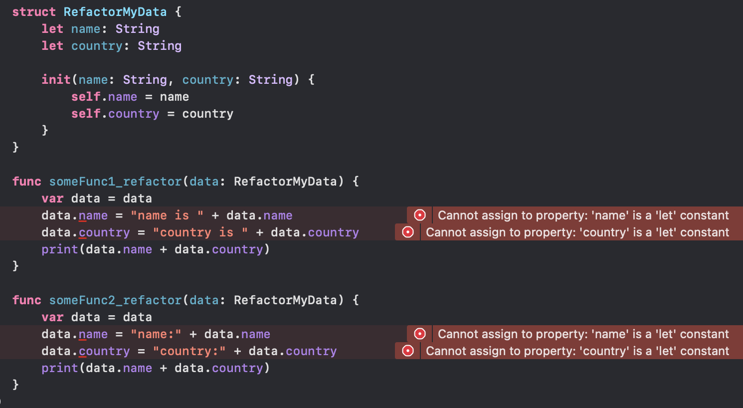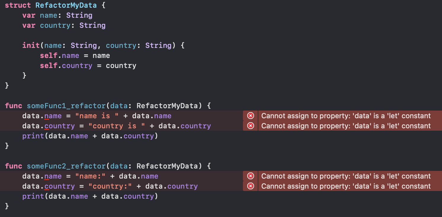 - 이때 name, country도 모두 불변성으로 let 선언하면 아래처럼 name, country를 변경하려는 코드도 compile error 발생