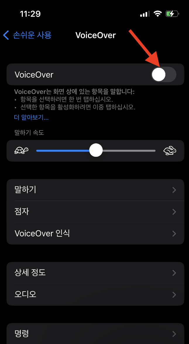 - 설정 > 손쉬운 사용 > VoiceOver 선택 > 활성화