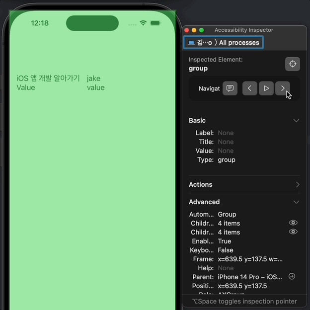 - Accessibility Inspector에서 초점 버튼을 선택한 후 시뮬레이터를 누르면 포커스가 시뮬레이터에 잡히고, 재생버튼을 누르면 자동으로 순서대로 수행