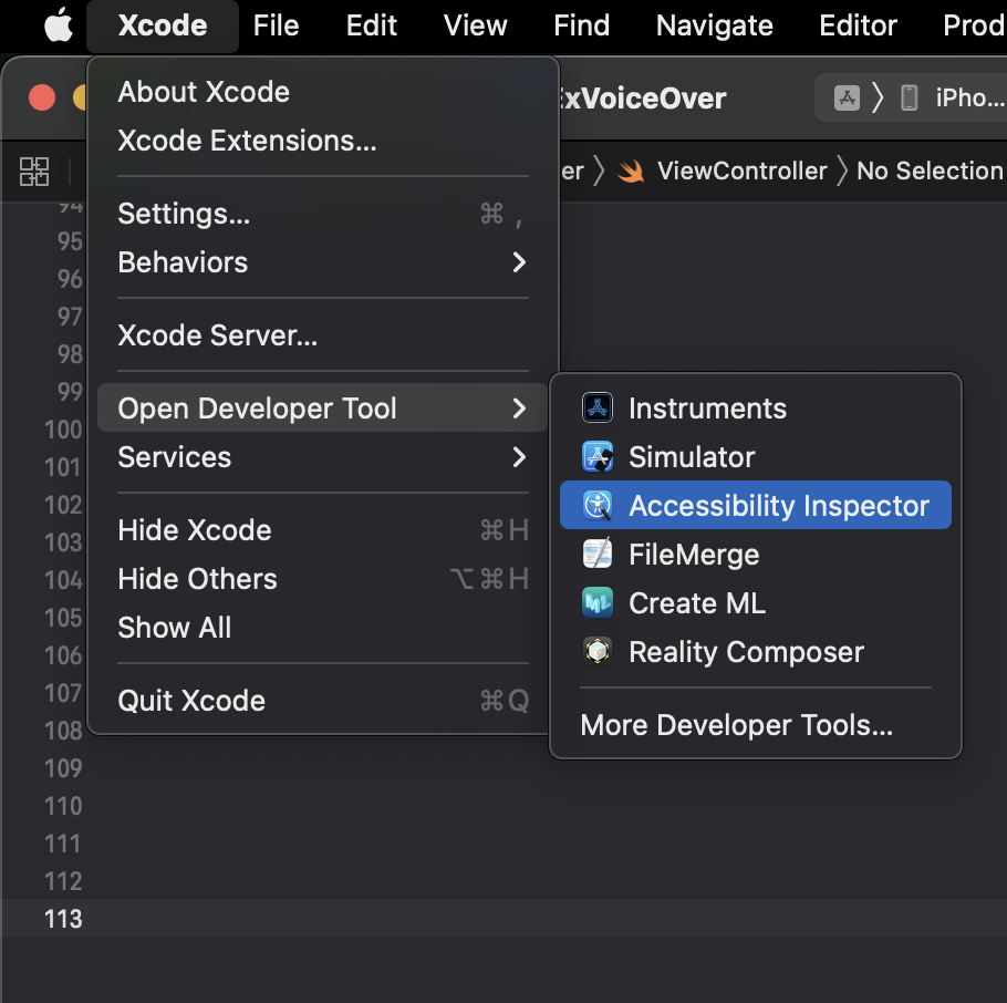 - Xcode > Open Developer Tool > Accessibility Inspector 선택