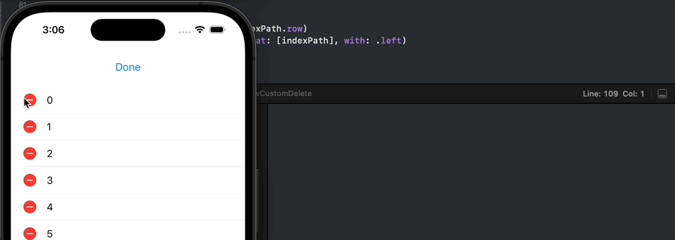 - @escaping (Bool) -> Void: 헨들러에다 액션에 성공했는지, 실패했는지 알려주는 클로저이며 해당 클로저를 실행하면 오른쪽 삭제 버튼이 사라짐 (실행하지 않으면 오른쪽 삭제 버튼이 그대로 남아있으니 꼭 실행해줄것)