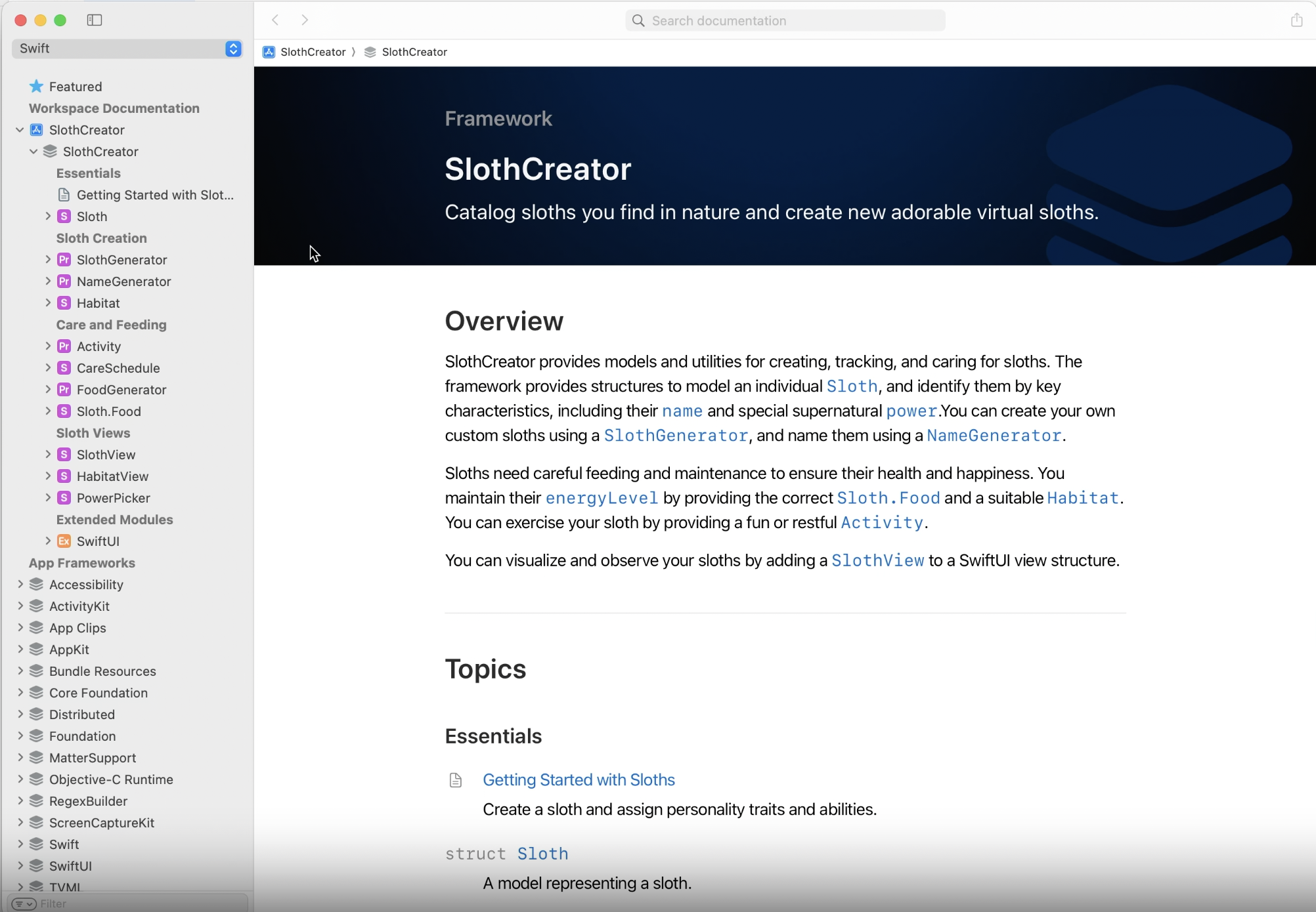 - Swift-DocC 형태로 사용하면 관련 API에 대한 페이지를 자동으로 생성해줌