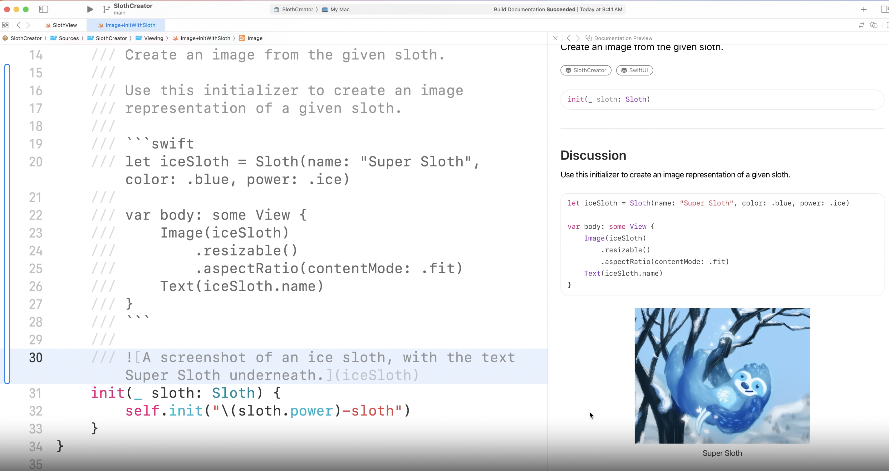 - Xcode15부터 markdown에 관한 preview가 제공되기 때문에 실시간으로 주석을 코드 바로 위에 작성하면 작성된 문서를 볼 수 있고 사진 넣기도 가능