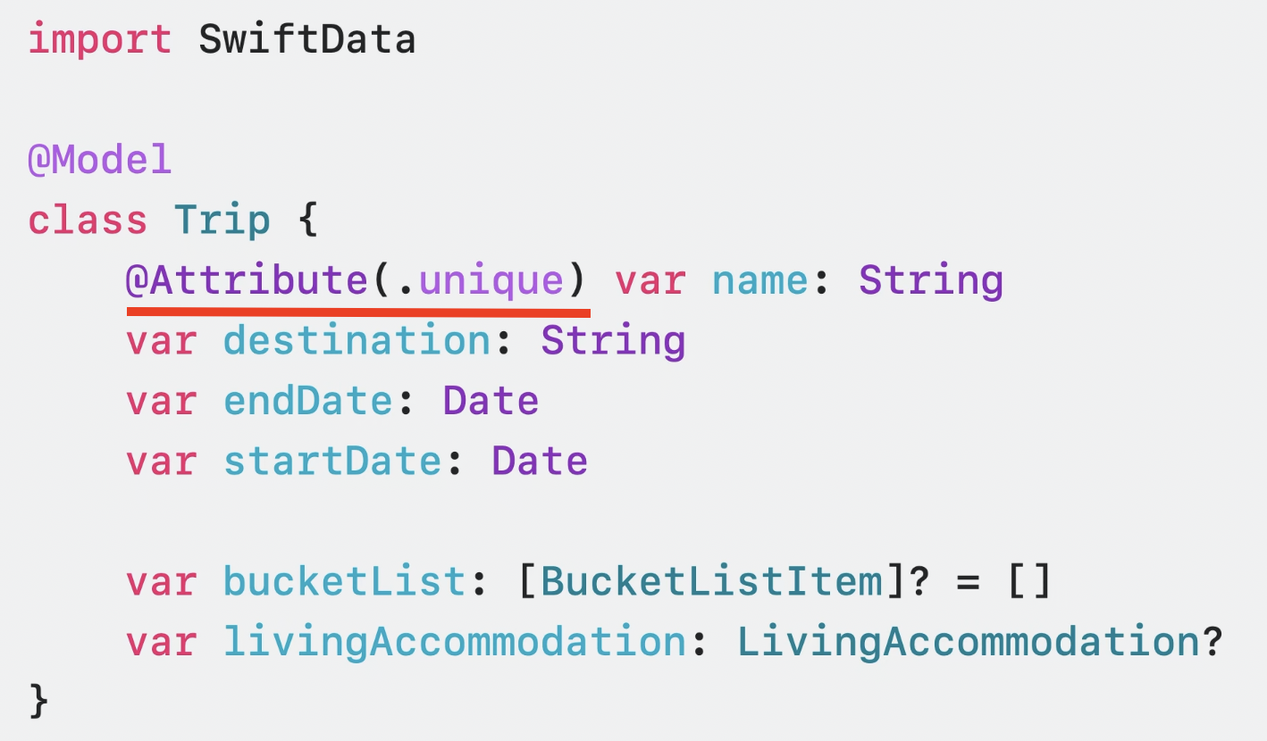 ex) @Attribute(.unique)를 변수 앞에 추가하여 유니크함을 지정
