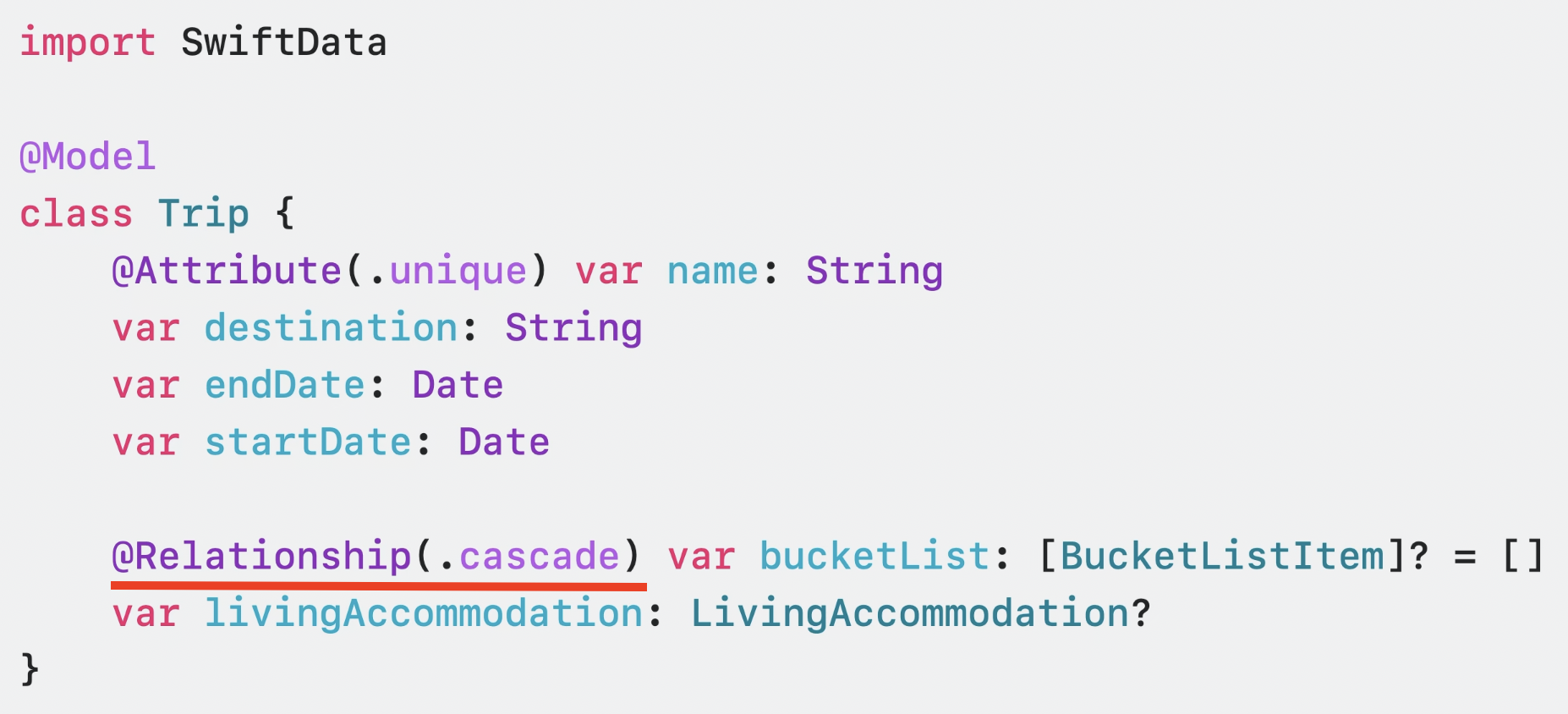 - @Relationship(.cascade)을 사용하여 이 변수가 삭제될때마다 SwiftData에 관련 항목을 모두 삭제하도록 지시하는 것