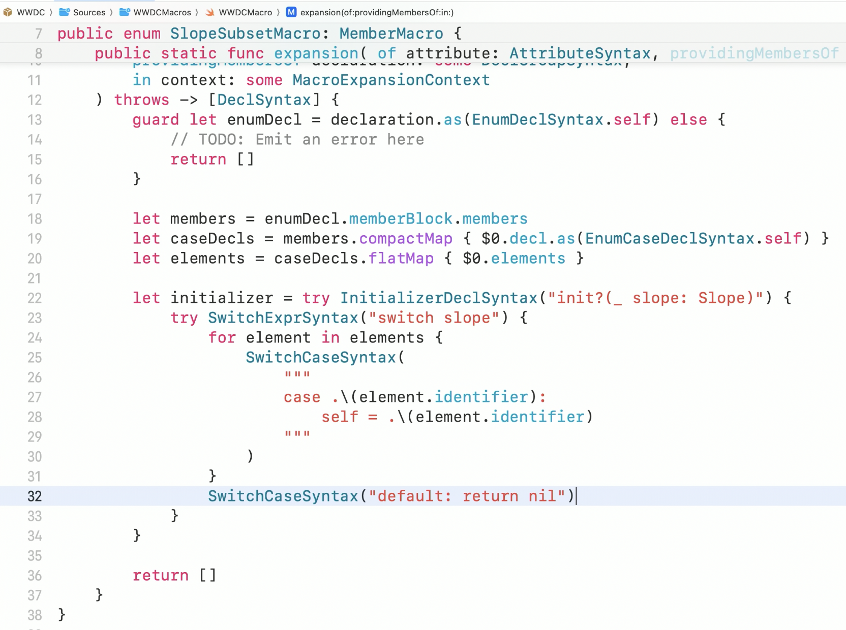 - InitializerDeclSyntax를 사용하여 init 구문을 만드는 매크로를 만들고, 위에서 얻은 elements를 for-loop돌면서 case 항목 표현식을 작성