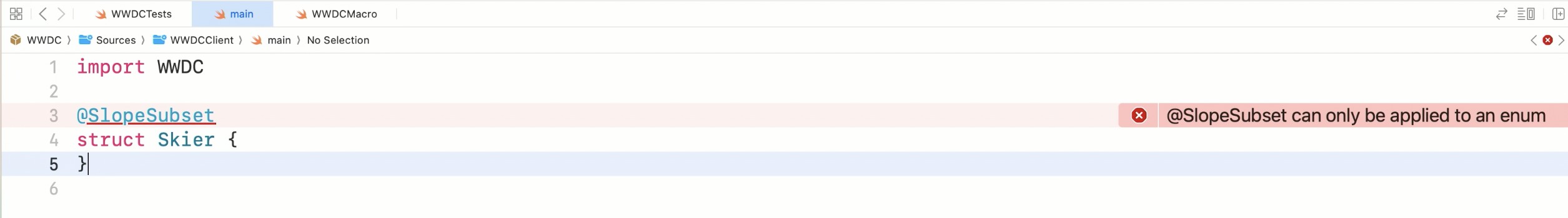 - 위에서 만든 스위프트 매크로를 EasySlope모델에 적용하기 위해, @SlopeSubset으로 선언하면 컴파일 에러가 발생