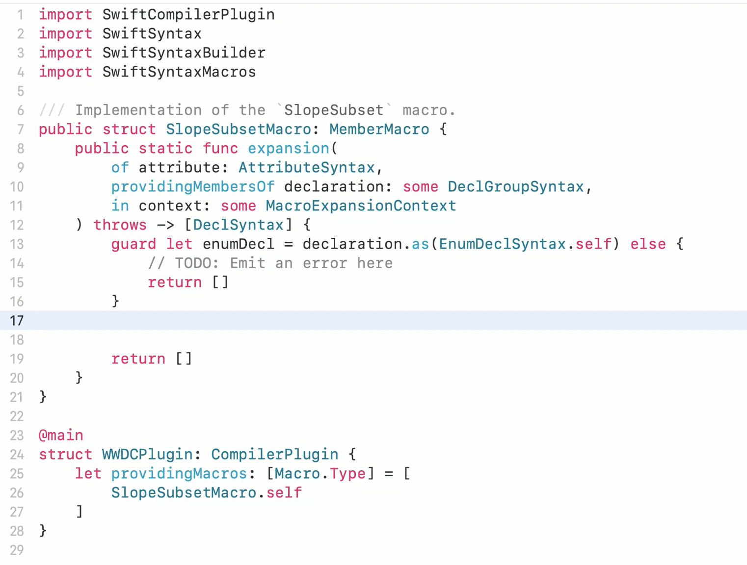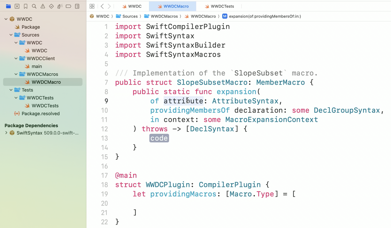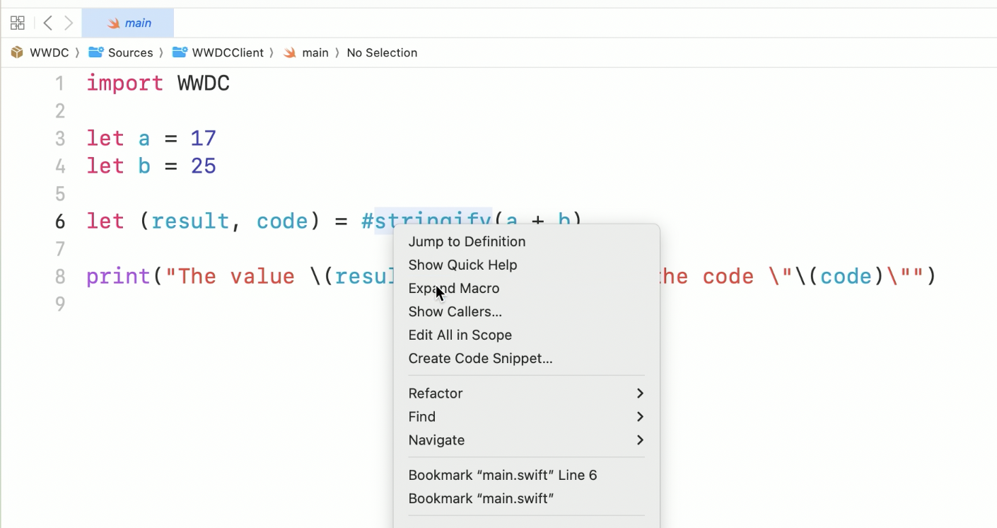 - WWDC라는 이름의 Swift Macro를 생성하면 템플릿 코드와 함께 생성