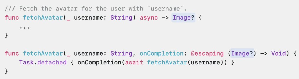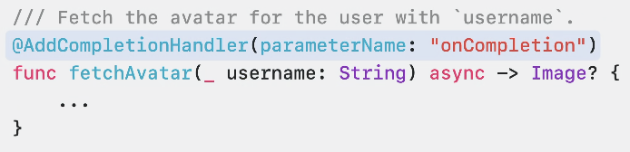 - @attached(peer) 매크로를 사용하고 이 매크로 안에서 async, await 버전의 메소드를 연결
