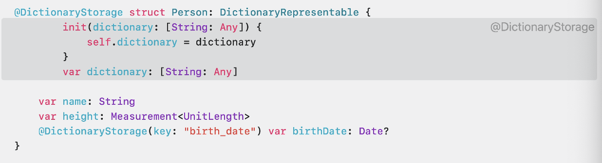 - @attached(memberAttribute)에 의해 Person의 property는 암묵적으로 @DictionaryStorage가 붙게됨