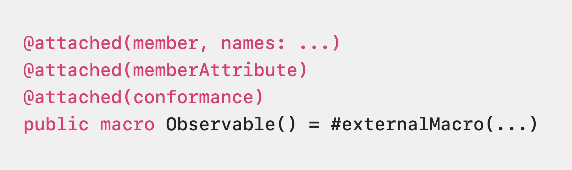 - attached(conformance): type이나 표현식에 프로토콜과 같은 타입들을 준수하게끔 할 수 있는 매크로 유형
