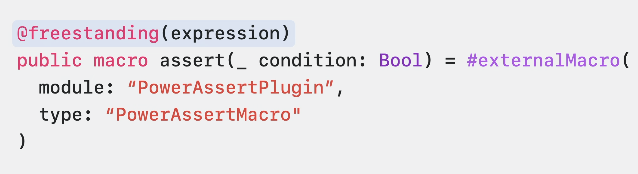 - macro를 정의할 때 위쪽에 @freestanding(epression)과 같은 키워드를 사용