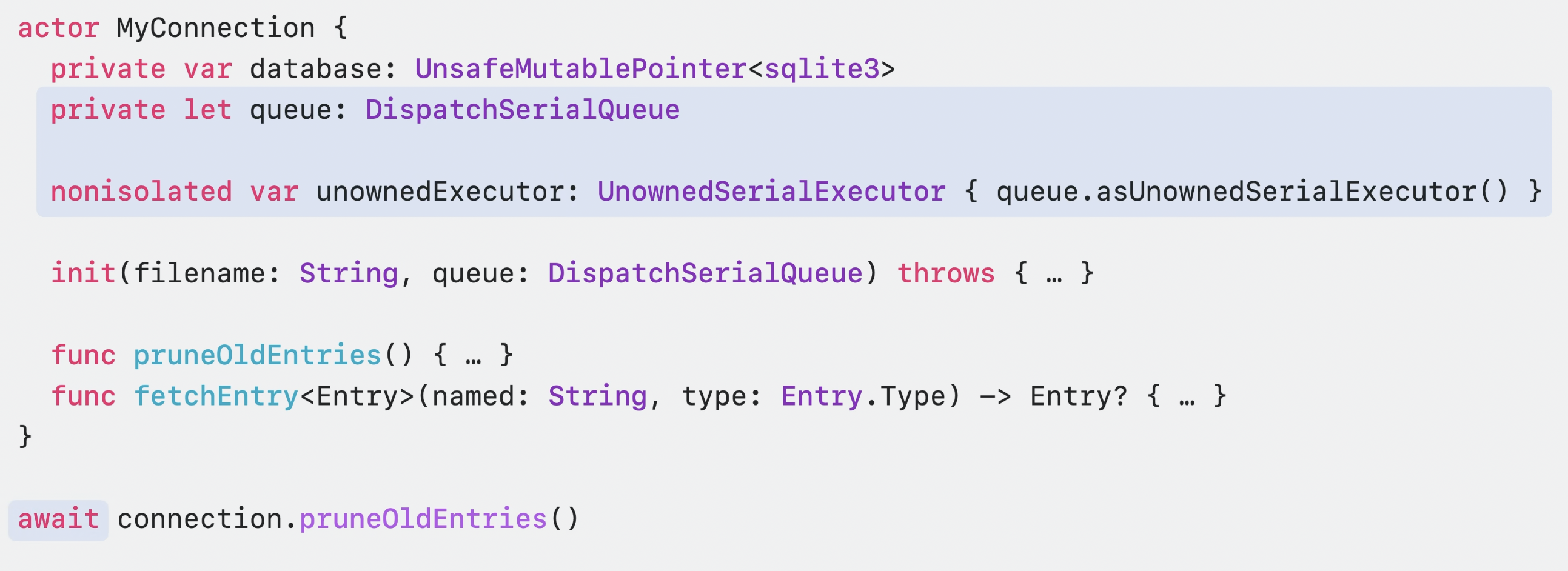 - actor 외부에서 await pruneOldEntries에 대한 호출을 하면, unownedExecutor에 의해서 disaptch-async를 수행함
