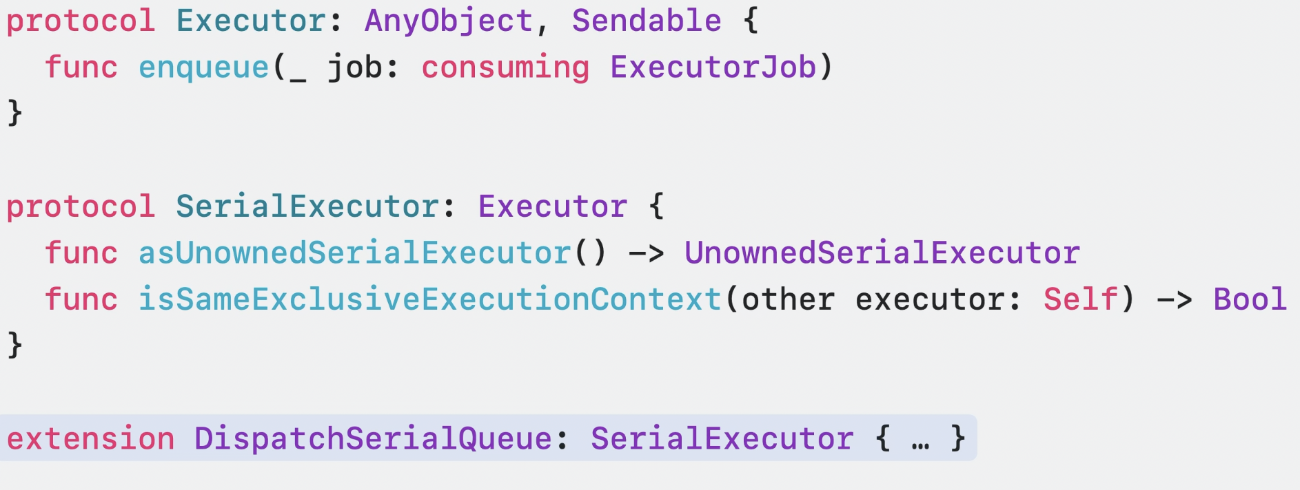 - DispatchQueue가 새로운 SerialExecutor 프로토콜을 준수하기 때문에 DispatchQueue를 통한 actor 동기화가 가능하다는 의미